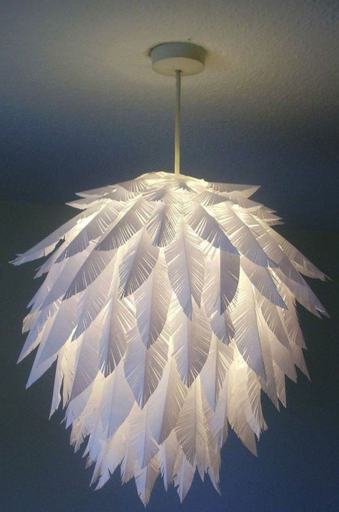 В итоге у вас выйдет очень нежный и легкий плафон, от которого будет исходить мягкий, приглушенный свет. В качестве материала подойдут и фигуры из бумаги, приклеенные на тонкие ленты и закрепленные на проволочных кольцах каркаса. Для более эстетичного вида используйте бумагу разных цветов, которая будет образовывать плавный переход от более темных оттенков снизу, до более светлых сверху. Помните, что бумага не является прочным материалом, зато ее легко заменить, если вам наскучит внешний вид светильника и придумать что-то новое.