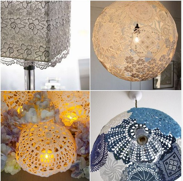 Такой яркий плафон будет напоминать радугу, и светиться различными цветами. Если у вас имеются вязаные кружевные салфетки, и вы не знаете, куда их деть, можно поступить с ними так же, как в 4 пункте. Пропитать клеем, расположить на шаре и дать высохнуть. Они приобретут форму сферы и будут выглядеть совсем иначе.