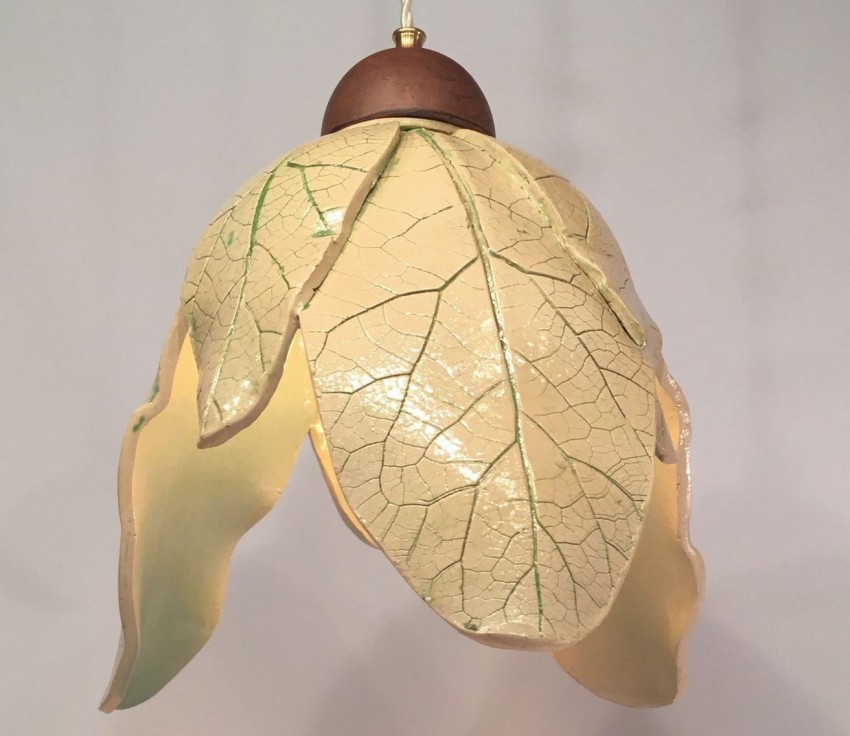 Мы использовали форму листиков. Нарисуйте несколько шаблонов разной величины, обведите их контуры и начинайте вырезать. Когда закончите нарезать необходимое количество элементов, придайте им естественный вид. С помощью тупого носика небольших ножниц выдавите на каждом листике жилки. Закрепить на каркасе детали можно двумя способами. Либо приклеить к каждому элементу проволоку и приматывать их к каркасу на разных уровнях, либо приклеить клеем на картонный каркас. Мы советуем отдать предпочтение более долгому, но и более красивому первому способу. Так плафон выйдет более светопроницаемым, а все детали будут заметны за счет размещения на разных высотах.