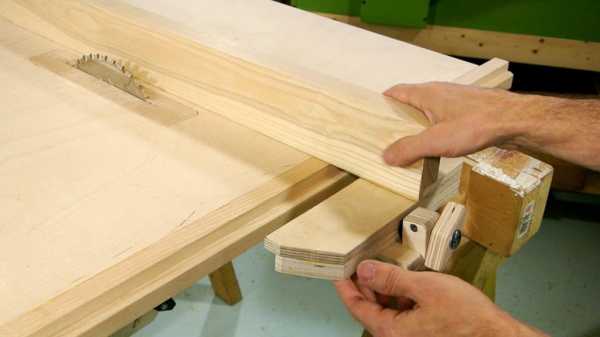 Чтобы сделать прижимную гребенку, понадобится прямослойная кленовая доска толщиной в 19 мм. Заготовка должна иметь размеры в 51х457 мм. Угловым упором на станке делают скосы, соблюдая угол в 30°. Поперек заготовки проводят косые линии, сделав отступ от концов в 67 мм. В станок устанавливают диск толщиной в 3 мм. Его необходимо поднять на высоту в 50 мм над столом. Упор отодвигают от диска на расстояние в 2 мм. Доску отводят назад. Заготовку разворачивают на 180°. Затем отодвигают продольный упор на 5 мм. На двух концах делают новые пропилы. Аналогичная операция повторяется с шагом в 45 мм.