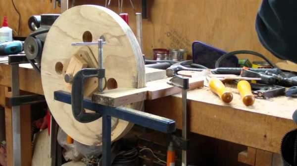 Стяжки приклеиваются к ножкам и фиксируются с помощью струбцин. Через первые элементы просверливаются направляющие отверстия, в них вкручиваются шурупы. Струбцины удаляются. К стяжке приклеивается планка для сетевого шнура и фиксируется струбцинами. Собранные ножки требуется отшлифовать, используя наждачную бумагу с зернистостью 220 единиц. Перевернутую крышку помещают на верстак, приклеивая к ней собранные ножки. Заготовку для прижимных гребенок можно выпилить из кленовой прямослойной доски, толщина которой 19 мм.