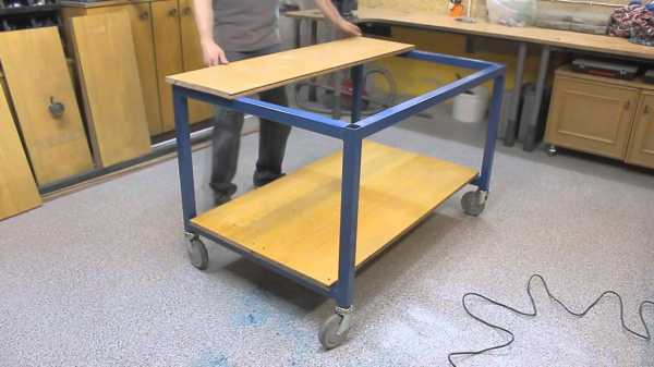 Самодельный стол для фрезера может быть расположен и в помещении с большой площадью. Для обеспечения максимального удобства вы можете изготовить отдельностоящий стол, который устанавливается на колеса, а после располагается, где угодно. Портативный стол можно настроить на выполнение операции и оставить на время, при этом он не будет мешать другим станкам, устройствам и инструментам.
