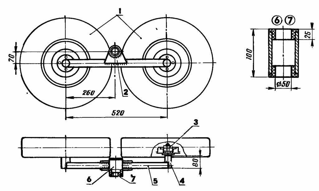 - В качестве ходовой части можно взять колесную базу от мотороллера, коляски, тачки или другой сельхозтехники. Тяжелые колеса от автомобильного прицепа со ступицами не рекомендуют устанавливать.
