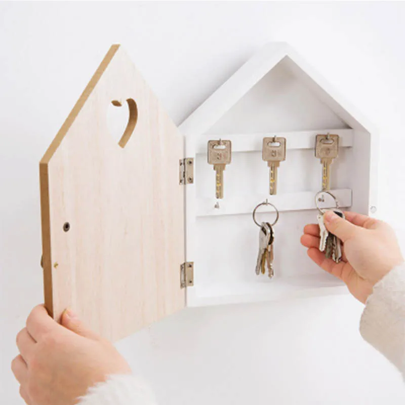 Вы можете сделать необычную ключницу-шкафчик из деревянной или фанерной коробки. Для этого нужно на тыльной стороне закрепить петли для подвеса на стену, а внутри небольшие крючки для ключей.