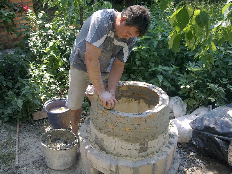 В качестве раствора рекомендуется использовать огнеупорные смеси, с добавлением шамотной глины. Когда основание затвердеет (3-6 дней), можно начинать строить саму печь.
