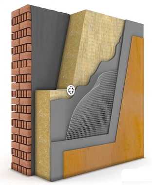 Основное отличие «мокрого» от вентилируемого фасада заключается в том, что в первом случае декоративную облицовку наносят непосредственно на жесткий плитный утеплитель (пенопласт, экструдированный пенополистирол), смонтированный на стене, а во втором — закрепляют в направляющих обрешетки, установленной на расстоянии 50-100 мм от теплоизолирующего слоя. Вентзазор между утеплителем и фасадной отделкой создает эффект «дышащих» стен, способствующих эффективному теплосбережению и оптимальному отведению влаги от несущих конструкций дома. Обязательное условие грамотно обустроенного навесного фасада — монтаж гидро-, ветро-, пароизоляционных мембран, например, пленок типа Ондутис A100.