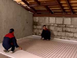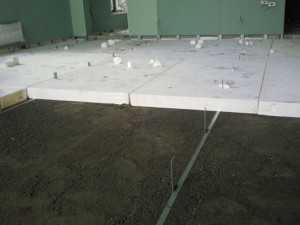 - Подготовка основания. Старую стяжку демонтируют и делают новую стяжку толщиной 25 — 80 мм. Перепад высот не должен превышать 10 мм. Слой выше 30 мм лучше делать из бетона с мелкозернистым заполнителем. Если в основании грунт, то делается песчаная или керамзитовая подушка толщиной не менее 10 см (керамзит затем также покрывается песком). Слои для лучшей усадки смачиваются водой. На песчаном основании делается цементная стяжка.