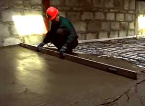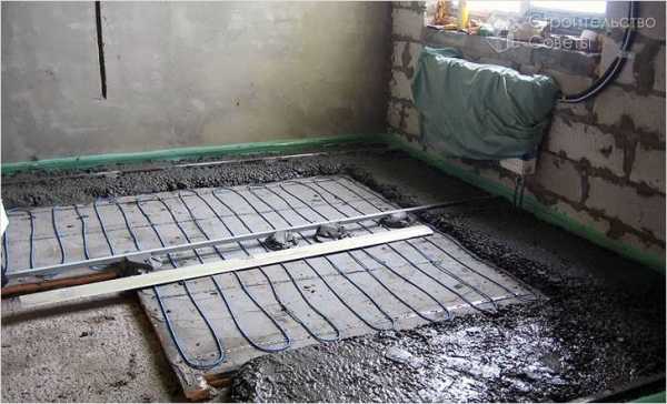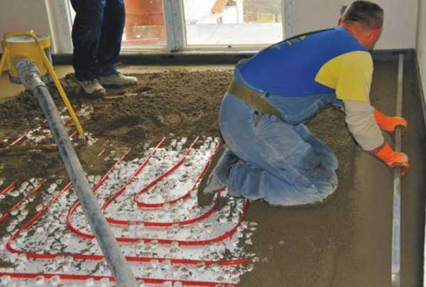 Поверх уложенной системы теплого водяного отопления размещается бетонная стяжка или цементно — песчаная стяжка, которая после укладки разравнивается по выставленным маякам длинным правилом.