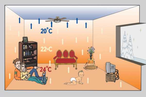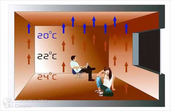 Тепло от отопительных приборов распространяется по помещению путем конвекции. Ее суть заключается в том, что воздух, температура, которого была повышена, поднимается вверх. По пути подъема часть ее рассеивается, он остывает и под своим весом опускается к полу. Это означает, что чем выше подняты радиаторы или другие изделия, тем они становятся бесполезнее. Другое дело, если их опустить на пол. У водяного теплого пола есть такие плюсы: