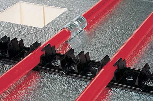Укладка и крепление труб отопления. Трубы теплоносителя согласно выбранной схеме раскладки укладываются на арматурную сетку и крепятся к ней пластиковыми хомутами. Расстояние между хомутами 30- 40 см.- Подключение контура отопления. Места выход труб отопления из бетонной стяжки защищают гофрированной трубой или уголком. Контуры водяного пода подключают к водяному распределительному коллектору. На окончание трубы устанавливается разборный фитинг, а с коллектором труба соединяется накидной гайкой.