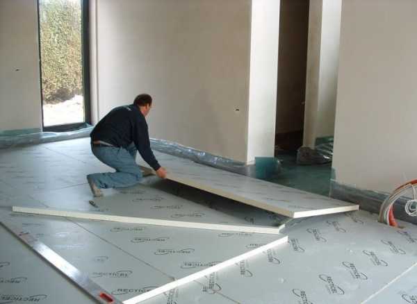- Теплоизоляция. На полиэтиленовую пенку плотно укладывают листы утеплителя — пенополистирола.