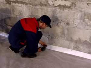 - Крепление демпферной ленты. По периметру помещения снизу к стене крепится демпферная лента. Способ крепления зависит от выбранной ленты: «самоклейка», саморезы с широкой шляпкой, «жидкие гвозди» и т.д.;