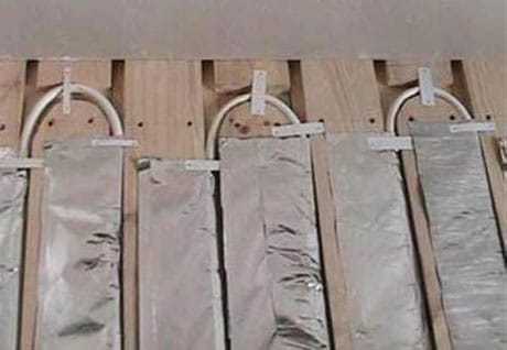 О теплоотражателях. Возможно несколько вариантов. В первом случае покупаем алюминиевые в виде листов, имеющих вдавленный профиль. Полоса служит теплоотражателем, а углубление крепежным элементом. Полосы прибиваем к доскам, утапливая профиль в зазоры между ними. Трубы укладываем в углубление, они надежно фиксируются в нем.