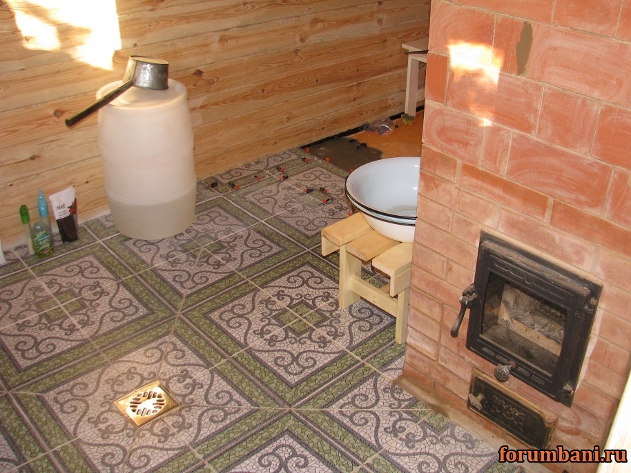 Если вы строите баню с нуля, то относительный теплый пол вы сможете обеспечить, постелив на него дерево. Если же вы хотите использовать водяную систему обогрева пола с принудительной циркуляцией, то идеальным вариантом будет заливка бетонной стяжки. Сверху нее будет укладываться керамическая плитка. Обратите внимание на тот факт, что отопительный пирог, который включает в себя стяжку, не должен быть единой частью фундамента.