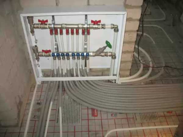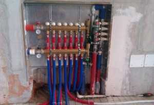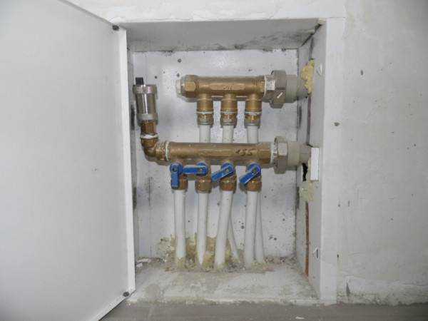 Планируя теплый пол как основное отопление жилья, следует уделить внимание обустройству подводящих линий. В центре каждого помещения необходимо выбрать место под шкаф для коллекторов. Это сравнительно небольшой контейнер с размерами 600*400*120 мм. Под него легко сделать место в стене при помощи перфоратора. Этот шкаф нужен для того, чтобы компактно поместить запорную арматуру и состыковать магистрали с подводящими тепло линиями.