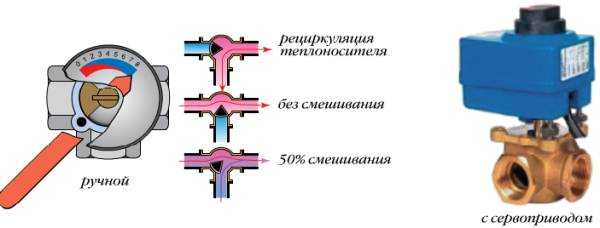 Смеситель — также необходимая вещь. Максимальная температура нагрева в полах — 50°C, в отопительные радиаторы вода подается при более высоких температурах. Если отводить воду из общей системы отопления в пол, то ее надо разбавить холодной водой до нужной температуры, что и делает смеситель