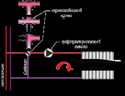 Обратите внимание на схему вверху, там показано, как врезается низкотемпературный контур, в данном случае – тёплый пол. Данный механизм мы используем для качественной регулировки, он подмешивает остывшую воду из возвратной трубы в подачу. По сути, это означает, что общий расход теплоносителя не изменяется, но в нужном направлении меняется его температура, при этом котёл работает в таком точно режиме, как и работал.