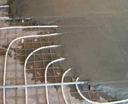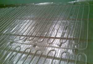 - Цементная стяжка — прекрасная среда для распространения тепла. Контактируя с горячей поверхностью труб, она становится огромной панелью, нагревающей воздух.