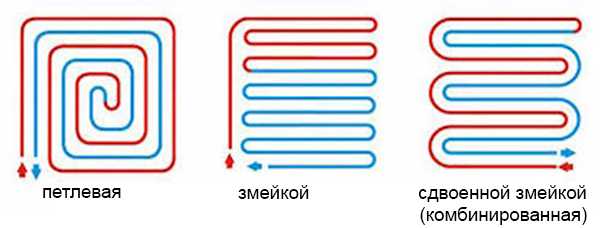 Укладка труб «змейкой» наиболее распространена. Альтернативой является укладка «улиткой». Первый вариант более прост в укладке, но дает неравномерный обогрев. Во втором варианте обогрев в целом более равномерный, но могут быть холодные участки пола, так как между подающими витками лежат витки обратного хода