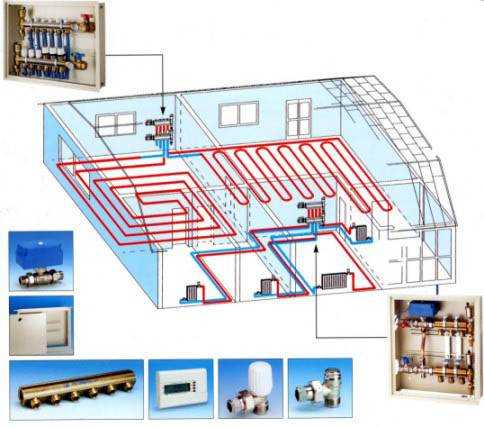 К подающей трубе через кран подсоединяют коллектор — отрезок металлической трубы с несколькими боковыми выходами. Последние используют для подключения участков магистралей теплого пола. Другой конец трубы не нужен, и его необходимо заглушить. Все эти комплектующие в специализированных отделах реализуются наборами и по отдельности. Так что никаких проблем с приобретением того или иного элемента конструкции не возникнет.