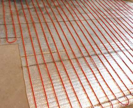 Для экономичности работы системы, чтобы не терять энергию от теплоносителя, на пол нужно подстелить отражатель, в качестве которого обычно применяют тонкий фольгированный пенополиетилен толщиной 2 мм, как это видно на верхнем фото.