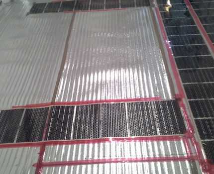 Укладывать его можно внахлёст, фиксируя стыки скотчем и его же можно использовать в качестве кромочной ленты – она послужит буфером при нагреве верхней стяжки. Под отражатель можно дополнительно подстелить ещё один слой гидроизоляции из толстой целлофановой плёнки.