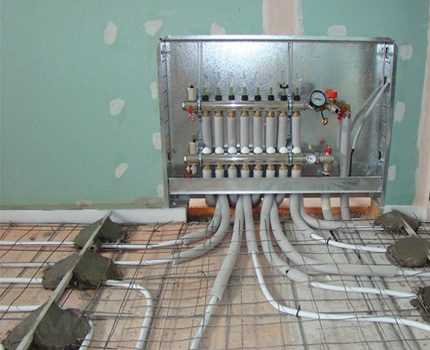 После монтажа коллекторного контейнера в него заводят концы подающей и обратной магистралей. Первая труба необходима, чтобы обеспечить подачу горячего теплоносителя от котла к уложенным под полом полимерным трубопроводам. Вторая же, наоборот, предназначена для отвода остывшей воды и транспортировки ее обратно к отопительному прибору. Для непрерывной и беспроблемной циркуляции возле котла устанавливают насос.