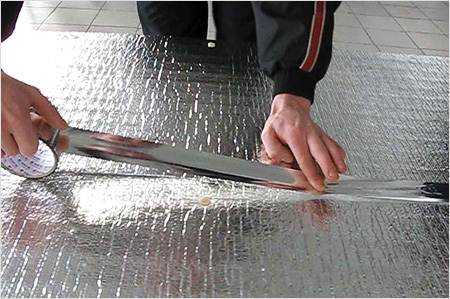 Шаг 2. Укладываем теплоизоляцию. Теплоизоляционные листы нужно класть на пол отражающей поверхностью вверх и проклеивать стыки между ними монтажным скотчем (клейкой лентой).