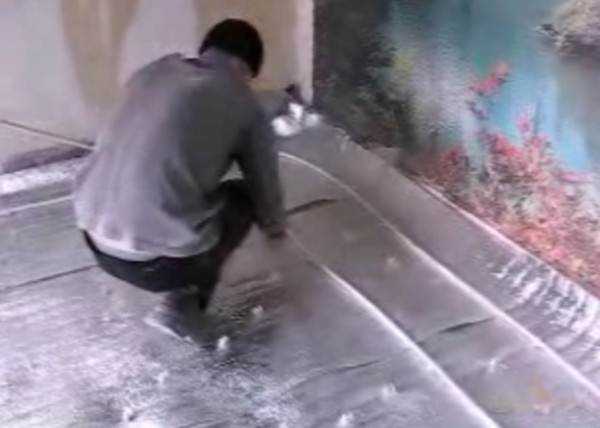Шаг 3. Гидроизоляция. Раскатываем пленку или рулонную гидроизоляционную мембрану, тщательно разравниваем ее и прижимаем к основанию, поднимаем края на стены (20 см). Если приходится использовать несколько полотнищ, то кладем их с нахлестом в 10 см, стыки скрепляем скотчем. Разрешено использовать и обмазочную, и литую гидроизоляцию в несколько слоев. Каждый предыдущий слой надо тщательно просушивать перед нанесением следующего.