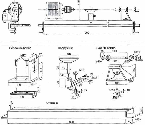 Бабки, переднюю и заднюю не сложно изготовить самостоятельно, а если что-то непонятно, можно подсмотреть на фотографиях самодельных станков. А раму, кроме деревянного бруска можно сделать из швеллера, уголка или другого сортового металла.