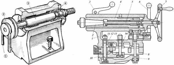 Устройство передней и задней бабки токарного станка. Передняя бабка (слева): 1 — ремень клинообразный; 2 — шкив двухступенчатый; 3 — шпиндель; 4 — подшипник шариковый. Задняя бабка (справа): 1 — корпус; 2 — центр; 3, 6 — рукоятки; 4 — пиноль; 5, 12, 14 — винты; 7 — маховик; 8 — тяга; 9, 10 — рычаги; 13 — гайка