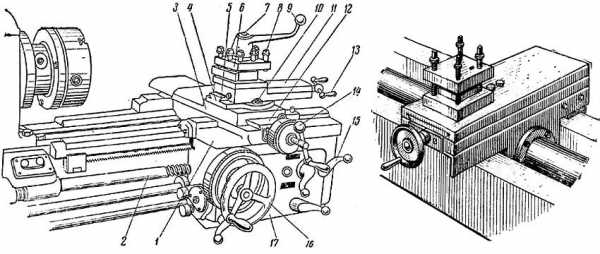 Устройство суппорта: 1 — каретка суппорта; 2 — ходовой винт; 3 — поперечные салазки суппорта; 4 — поворотная часть суппорта; 5 — направляющие поворотной части; 6 — резцедержатель; 7 — винт для закрепления резцедержателя; 8 — винты для закрепления резцов; 9 — рукоятка для поворота резцедержателя; 10 — гайки; 11 — верхняя часть суппорта; 12 — поперечные направляющие каретки; 13 — рукоятка для перемещения верхней части суппорта; 14 — рукоятка для перемещения поперечных салазок; 15 — рукоятка для включения подачи суппорта от ходового винта; 16 — маховичок для продольного перемещения суппорта; 17 — фартук