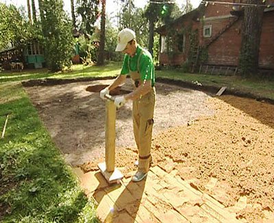 Принцип обработки своими руками заключается в том, что при помощи самодельного инструмента по поверхности наносятся удары, благодаря чему происходит уплотнение песка и щебня. При этом трамбовка выполняется после закладки каждого из этих слоев.