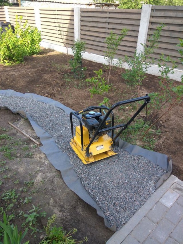Из-за этого при укладке подстилающего слоя, частицы материала прилегают друг к другу не полностью, образуя большое количество воздушных пустот, появление которых, в конечном счете, приводит к снижению уровня сопротивления нагрузкам. Если фрагменты щебня будут плотно прилегать друг к другу, объем материала сократится, но при этом образуется более прочная основа. - Если щебень укладывается на скалистый грунт, то можно обойтись без трамбования. В этом случае необходимо только разровнять гравий.