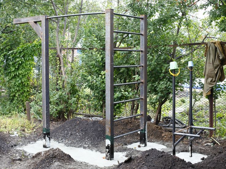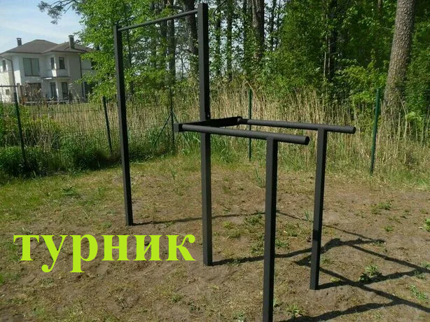 Самый обычный уличный турник представляет собой простейшую П-образную конструкцию. Две стойки и перекладина сверху. Но если есть место для более сложных конструкций, то можно соорудить целый гимнастический комплекс с брусьями и лестницами.