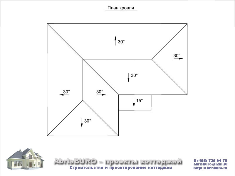 Г-образная крыша дома с равными фронтонами.