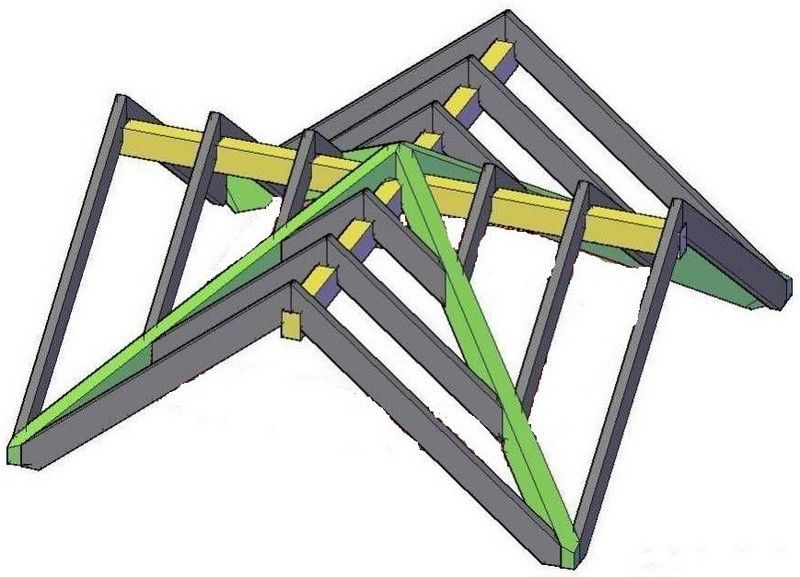 Такие элементы имеет в своем составе и вальмовая крыша. Стоит знать, что на диагональные стропильные ноги ложится нагрузка от двух частей Г-образной крыши. Поэтому их делают сдвоенными по толщине. Устанавливают угловые стропила о внешнем и внутреннем углах кровли.