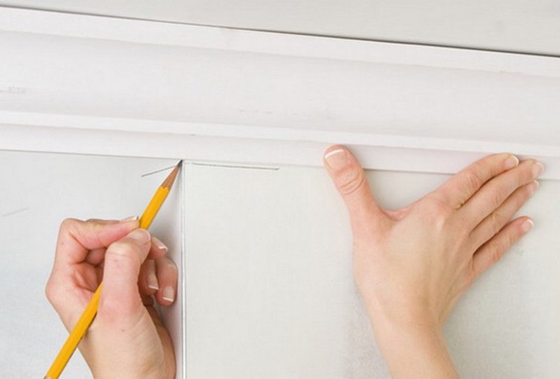 Карниз укладывают горизонтально и проводят поперечную линию. Расстояние от нее до края изделия должно быть равно его ширине. Затем с обратной стороны от линии к краю провести диагональ и по ней ножом или пилой вырезать край. Соседний элемент также обрезается.