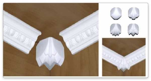 Внешне уголки представляют собой самостоятельный декоративный элемент, имитирующий гипсовую лепнину, как и сам молдинг. Поэтому при их выборе важно, чтобы они не только были подходящего типоразмера, но и гармонировали с декором потолочного плинтуса и со всем оформлением комнаты.