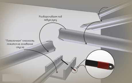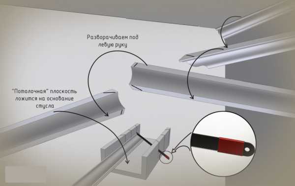 Следующий момент – как обрезать плинтус в зависимости от его расположения. Правило очень простое: левый всегда прикладывается к стуслу слева, а правый – с правой стороны. Если перепутать очередность, как резать потолочный плинтус, то стыковка станет настоящей проблемой.