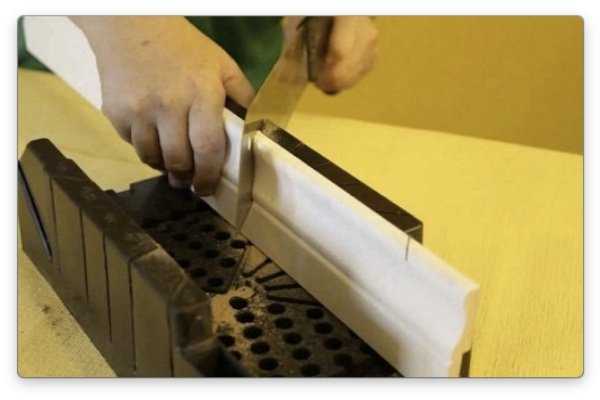 Работать с пенопластом проще всего. Давайте рассмотрим, как обрезать потолочный плинтус по всем правилам: