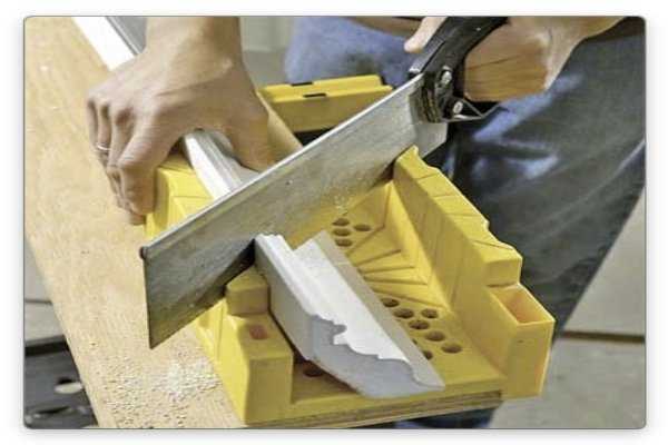 Для обрезки потолочного плинтуса подойдет и более дешевый инструмент — ножовка. Такая пила стоит недорого, а работать с ней легко и просто. Однако, у нее есть свои недостатки. Ножовка может испортить материал. Пластик или дерево низкого качества при распиливании может крошиться или распадаться на волокна.