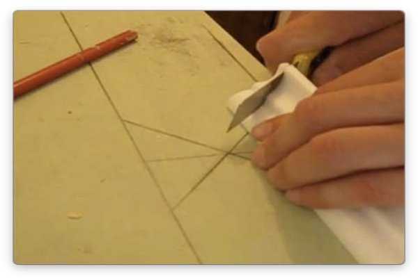 - после разметки линий обратите внимание на точку их пересечения. Это и есть отметка, по которой нужно выполнить обрезку;