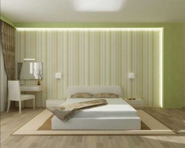Дизайнеры также часто используют подсветку к обоям. Данный метод имеет место быть. Его применяют как в случае с маленькими, так и с большими комнатами. Для небольшой следует использовать светильники маленьких размеров. Их можно разместить в карнизе, «поднять» ими тумбочки или кровать.