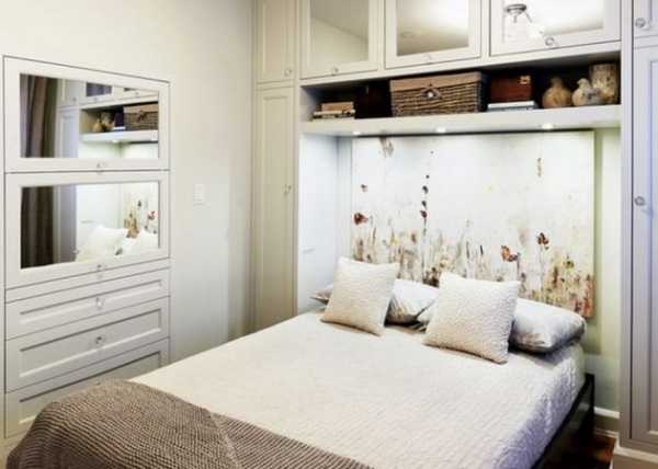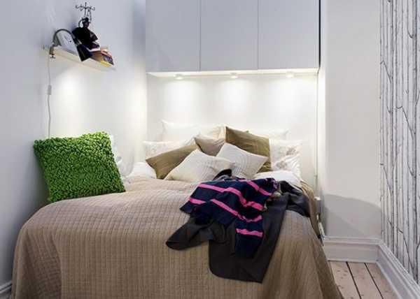 Или над кроватью. Например, на фото ниже за счёт навесных конструкций решены сразу две проблемы: образовалось место для хранения и ниша, которая зрительно расширяет комнату.