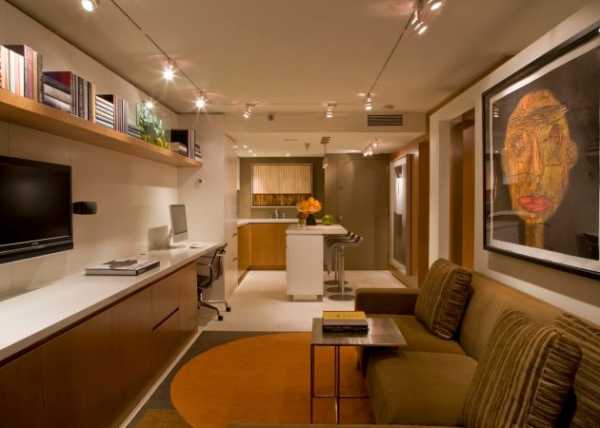 - Играйте светом. От стандартной люстры в центре потолка лучше отказаться. Расширить узкую комнату помогут светильники-споты, размещенные в центре потолка, если их свет направить на стены.