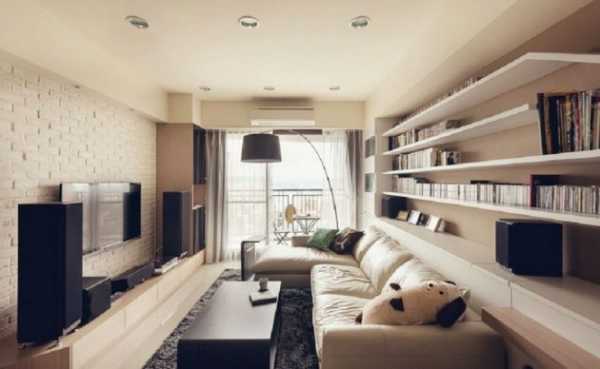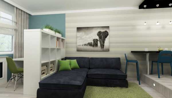 - Разделите общий объем на функциональные зоны с помощью стеллажа, открытого с обоих сторон и размещенного перпендикулярно к длинной стене – такой прием позволит раздробить пространство и исправить невыгодные пропорции.