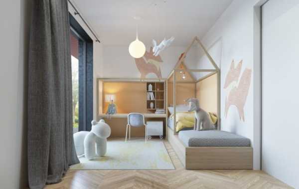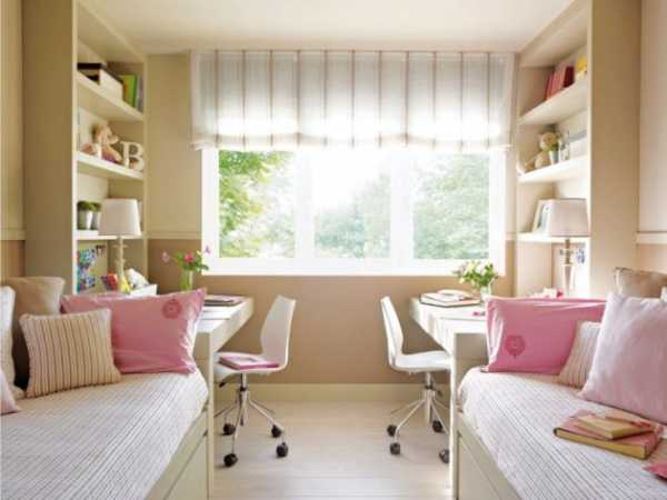 Если у вас двое детей, то симметричное расположение мебели вдоль противоположных стен может спасти узкую комнату. К тому же у каждого ребёнка будет хорошее освещение и вентиляция.