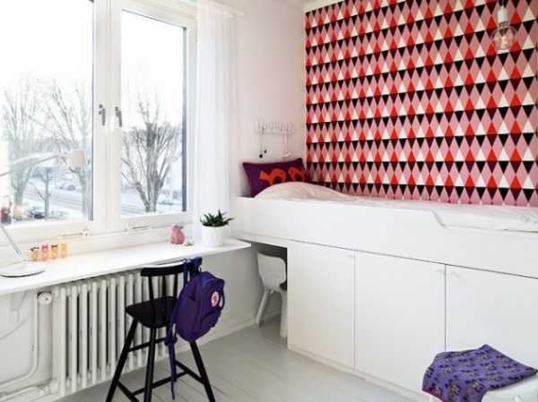 Если хватает места, то кровать лучше всего поставить поперёк комнаты к окну. Так вы визуально расширите пространство и сохраните больше места в помещении.