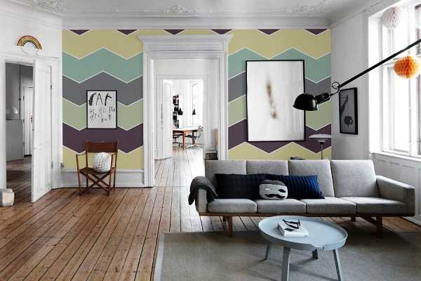Допускается прием контрастной стены. Для этого одну сторону в комнате выделяют при помощи рисунка. Лучше, если это будут геометрические формы. В чем особенность? Цветовая гамма этой поверхности должна быть спокойной и не сильно отличаться от общей стилистики. Таким образом получится обмануть зрение – любой человек будет думать, что пространство больше, чем на самом деле.